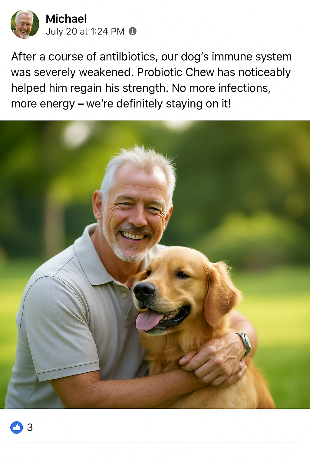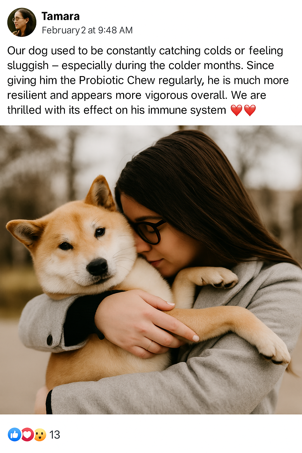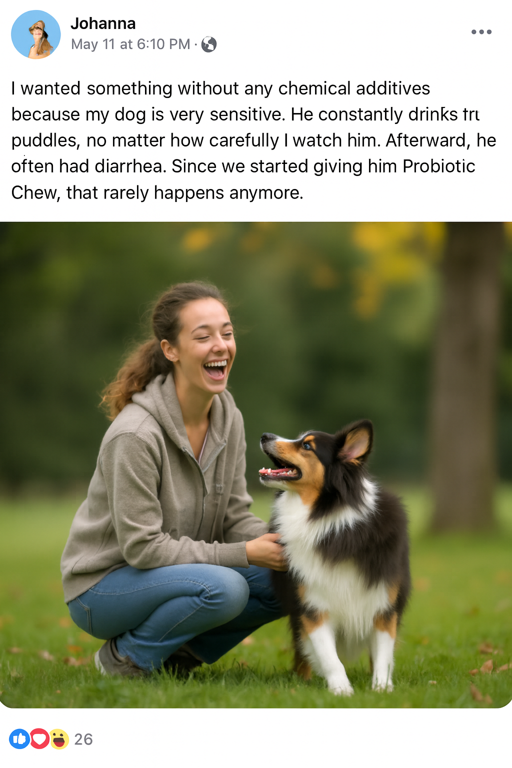 I’ll be honest: I first tried Probiotic Chew because I was tired of always bringing wipes for every walk. Now his stool is firmer, my dog is happier – and I’m more relaxed :)